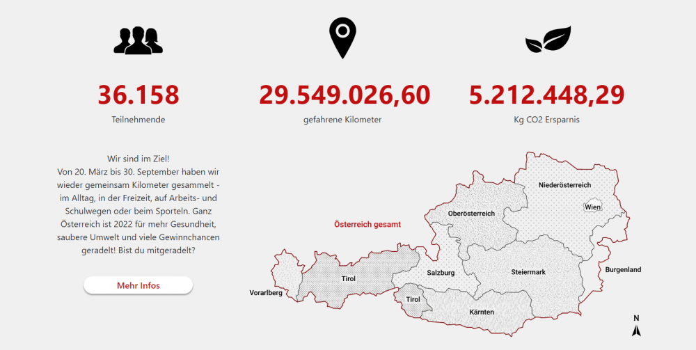 Heuer haben Niederösterreich, Vorarlberg und Tirol es am häufigsten geschafft, sich das Siegerpodest zu erradeln und tolle Preise zu gewinnen. Aber auch andere Bundesländer haben Spitzenkandidaten, wie ihr in der Statistik nachlesen könnt. Bei den Neueinsteiger:innen konnte sich auch das Burgenland durchsetzen und in der Kategorie der Schulen glänzen.