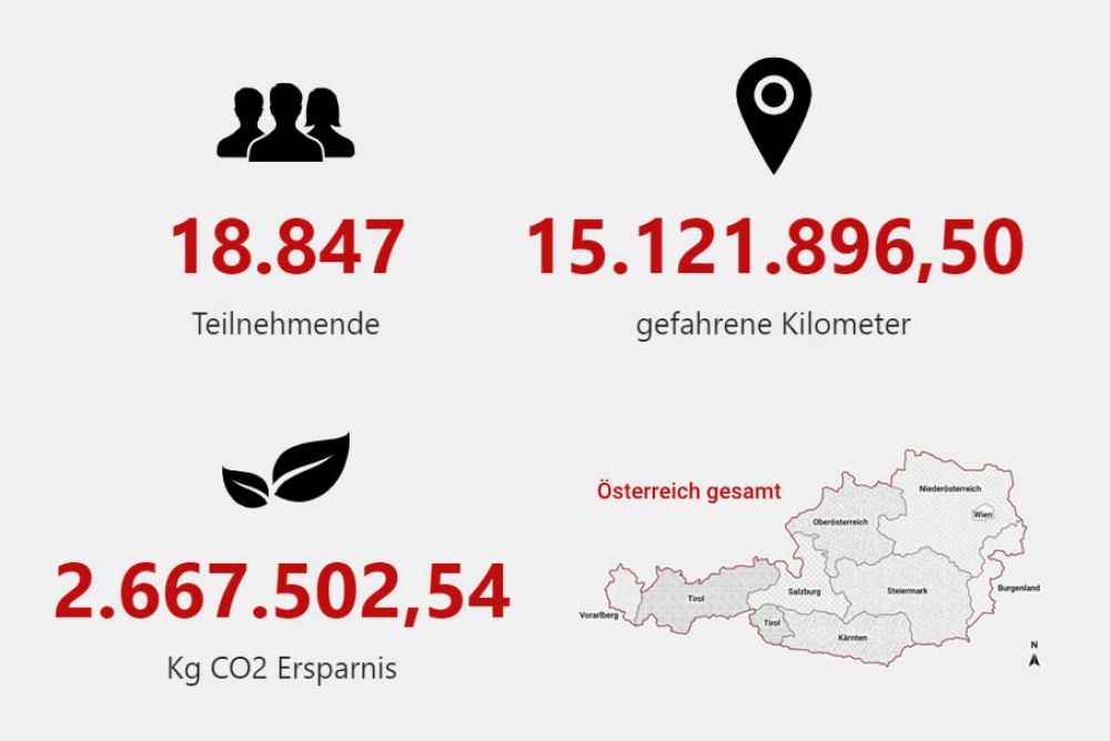 Die erfreuliche Bilanz der Hauptaktion 2020 kommt durch die Kooperation der acht* aktiven Österreich-radelt-Bundesländer zustande. Trotz der widrigen Bedingungen durch den Corona-bedingt verschobenen Start und die Einschränkungen an Arbeitsplätzen und Schulen konnten einige Bundesländer sogar mehr TeilnehmerInnen als im Vorjahr verzeichnen. Insgesamt konnten die Zahlen des Vorjahres mit 27.000 TeilnehmerInnen heuer verständlicherweise nicht erreicht werden - wir sind dennoch sehr zufrieden! Danke an alle TeilnehmerInnen und die engagierten AdministratorInnen der teilnehmenden Betriebe, Gemeinden, Vereine und Schulen!